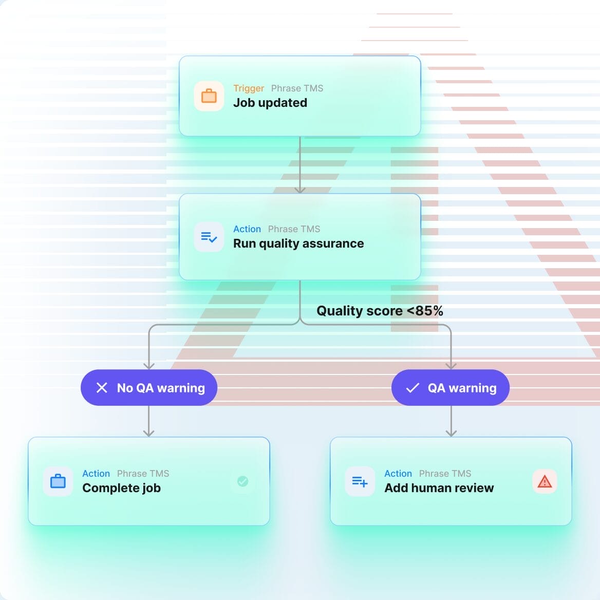 Mit einem individuell angepassten Workflow lassen sich zusätzliche Sicherheitschecks einbinden. So kann man beispielsweise automatisch zusätzliche Reviews hinzufügen oder menschliche Übersetzerteams benachrichtigen lassen, wenn QA-Warnungen ausgelöst werden.
