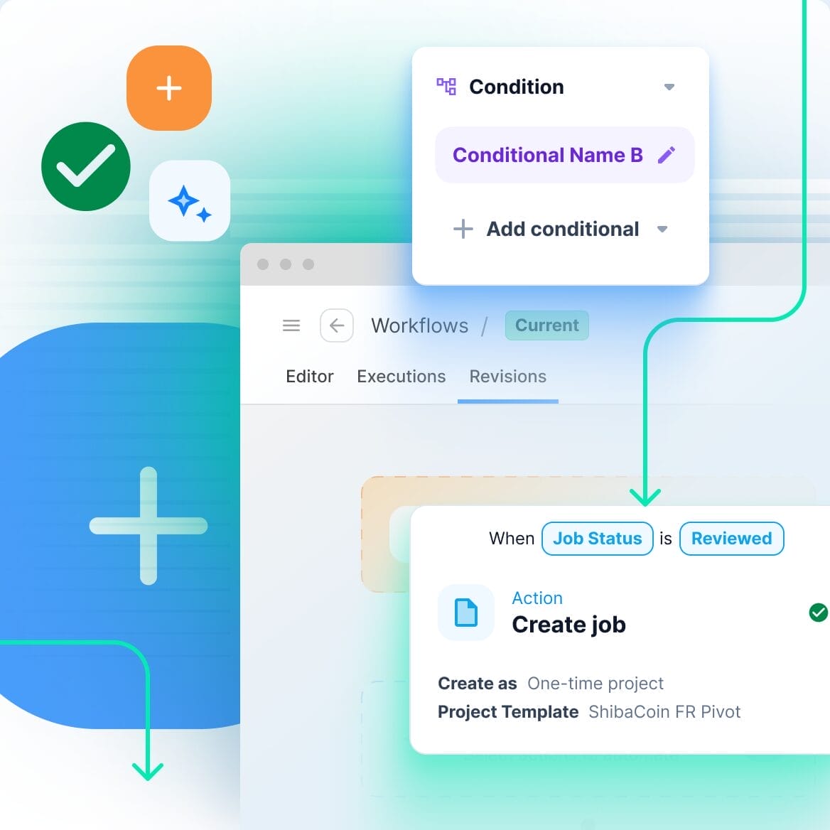 Der Umgang mit unserem intuitiven Workflow-Editor ist ein Kinderspiel. Bei der Erstellung neuer Automatisierungen werden Bedingungen wie Workflow-Branching, Event-Filterung und dynamische Referenzen farblich akzentuiert und übersichtlich dargestellt – für schnelle Reviews und bessere Zusammenarbeit.