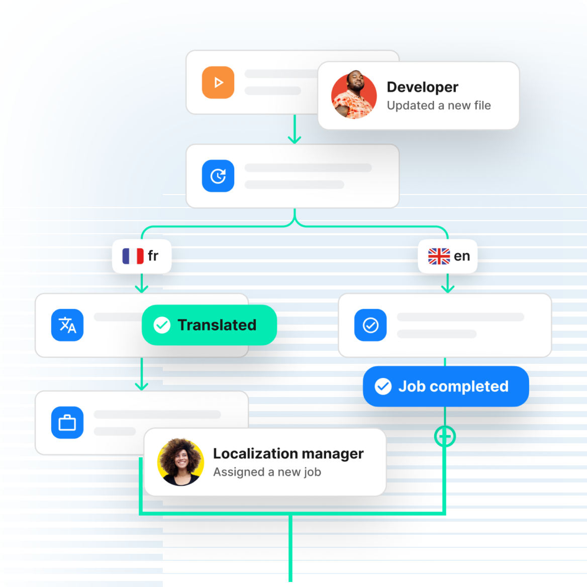 Dank der Drag-and-Drop-Funktionalität lassen sich komplexe Workflows über die gesamte Phrase Localization Platform