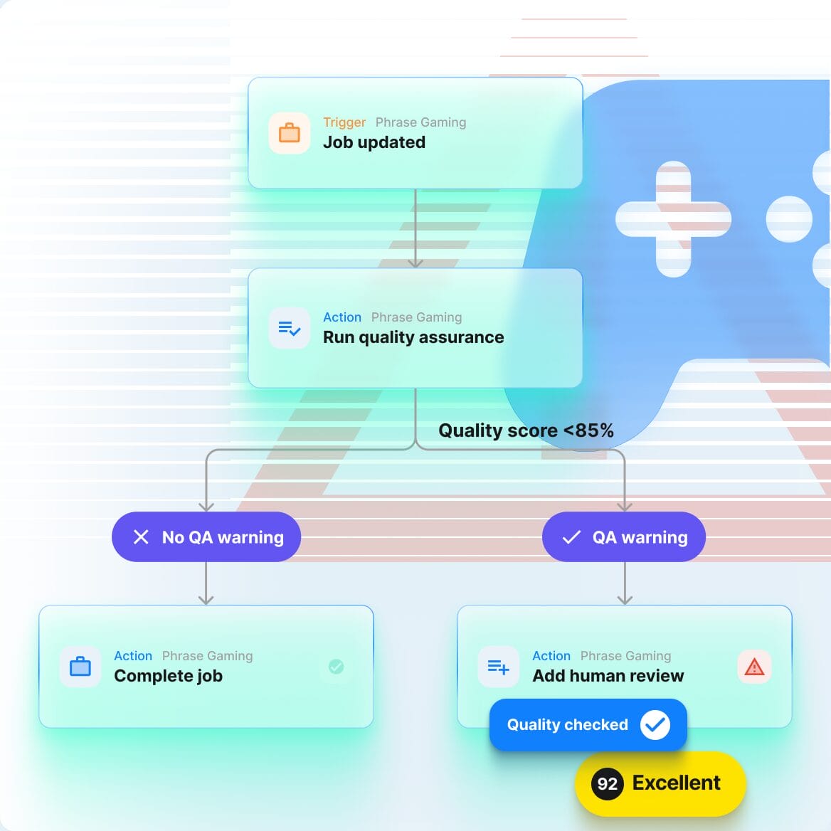 Leverage machine translation trained on your content and terminology to reduce post-editing time and costs for high-volume, or long-form content such as player guides. Our quality scores can be set up to automatically route content to human linguists only when post-editing is required, ensuring top-notch quality where it’s needed.