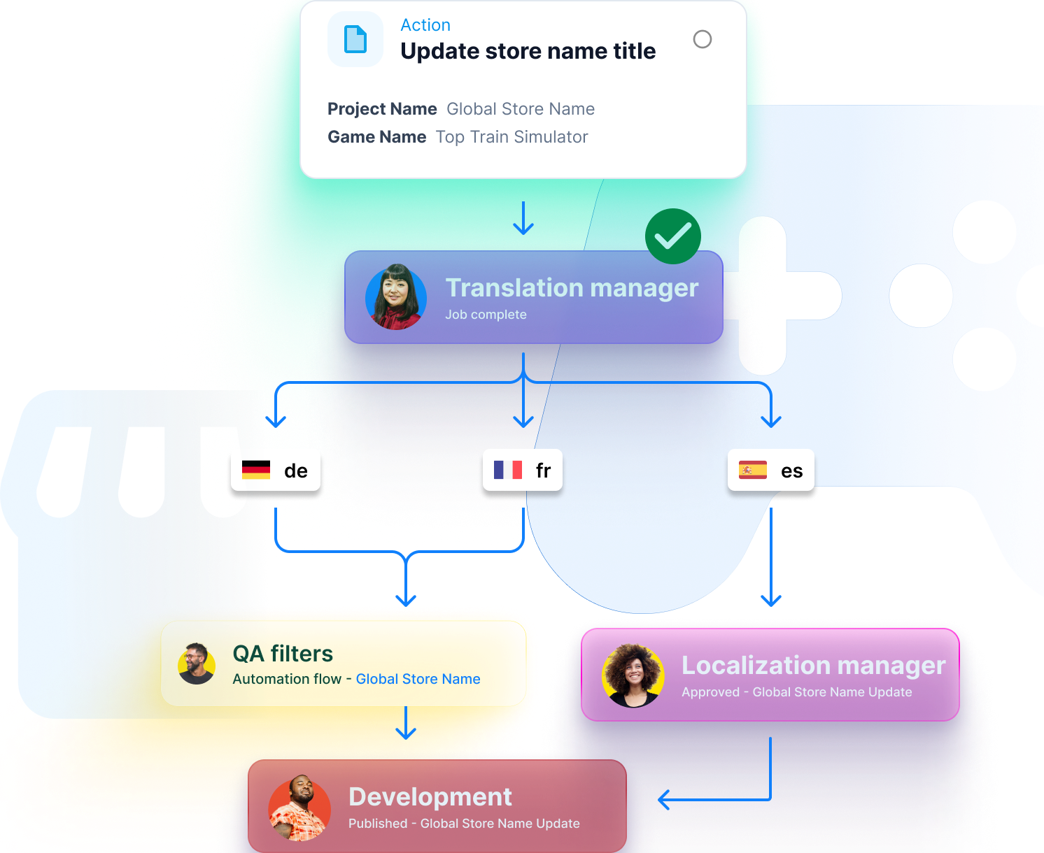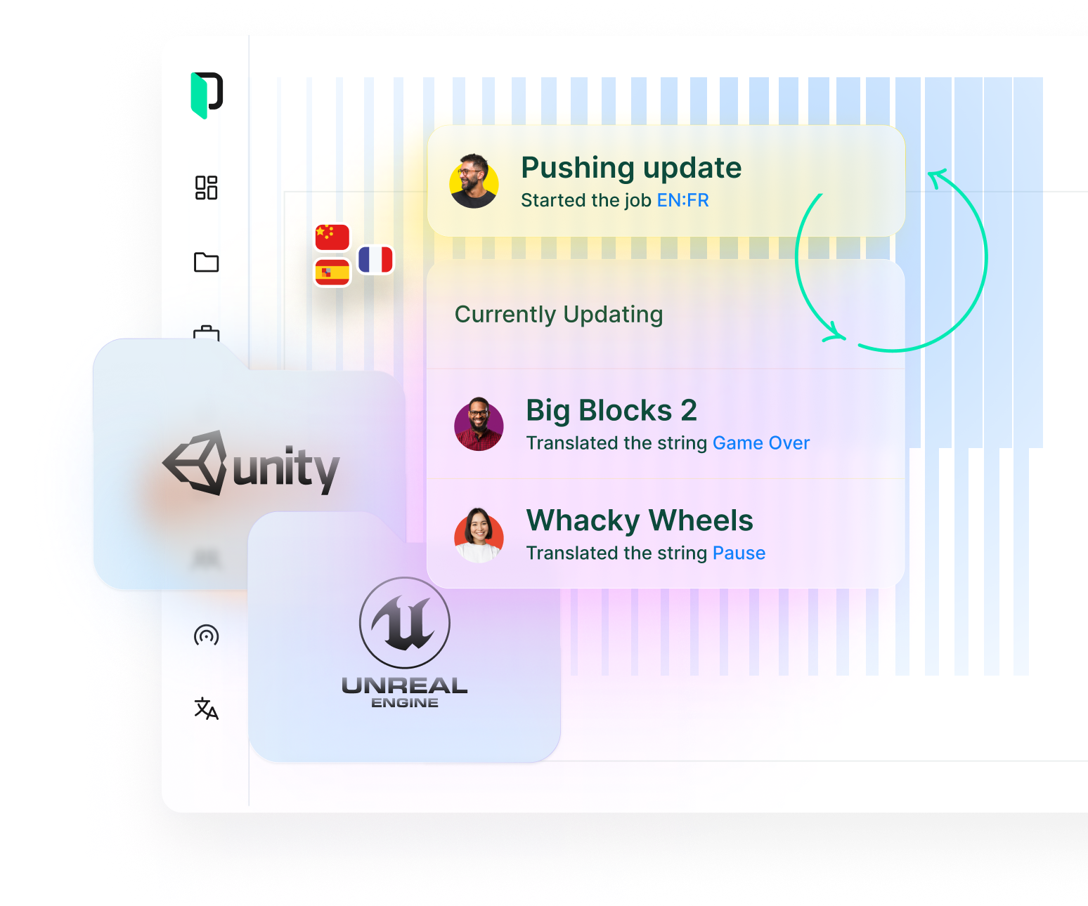 Frequent updates demand a continuous approach to localization. Built by developers for developers, the Phrase Localization Platform integrates with game engines like Unity and Unreal, directly connecting creators with translators. Make localization an integral part of your game development cycle, manage frequent over-the-air updates, and save valuable time and resources with automated QA checks during testing.